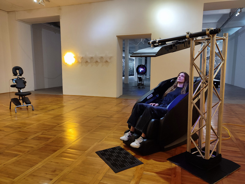 1 ✯ Review Tour Pula (2025.) Video, automatska masažna stolica, ekran, zvučnici, žuti kabel za napajanje.
