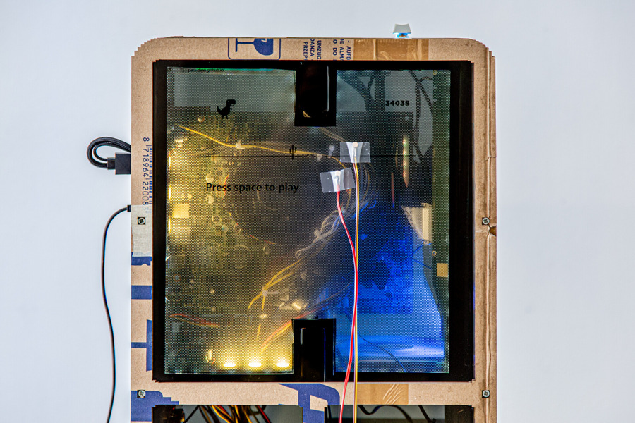Reciklirani kartonski listovi, hakirana igra „Dino“, samostalno izrađen prozirni zaslon i PC hardver s RGB osvjetljenjem.