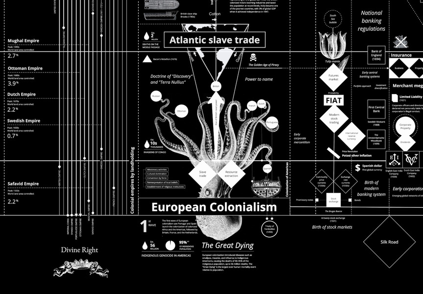 Protežući se kroz pet stoljeća i dvadeset i četiri metra, izračunavanje carstava prikazuje isprepletenost kolonijalne ekstrakcije, izračuna i kontrole. Projekt ne počinje s računalima, već s karavelama, prateći kako su se planetarni sustavi razvili iz brodskih dnevnika, kartografskih apstrakcija i klasifikacijskog nasilja.